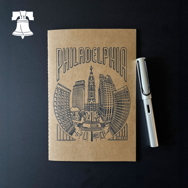 The Philadelphia skyline — captured in clean hand drawn lines and printed by hand on a kraft cover that feels as timeless as the city itself.