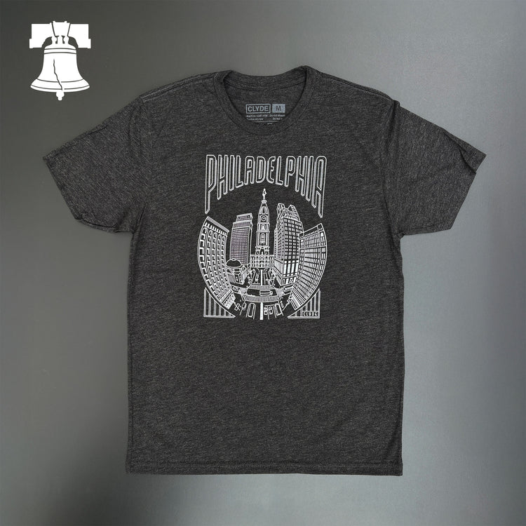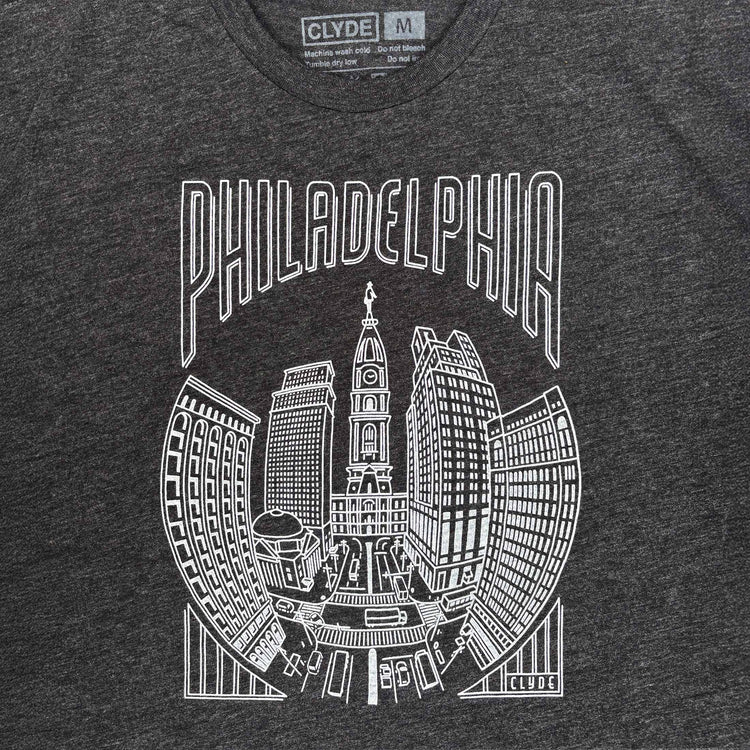 Inspired by the walk up the Avenue of the Arts, this Skyline tee captures a hand-drawn view of City Hall — drawn line by line (no AI) and printed by hand with water-based inks here in Philly. The black heather tri-blend fabric feels broken-in immediately, giving you a comfortable, everyday nod to the city.