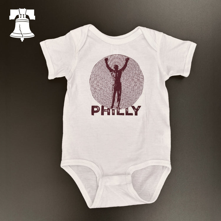 This Rocky LP onesie features our hand-drawn Rocky-meets-vinyl graphic, screen-printed right here in the Philly area using soft, baby-safe water-based inks.