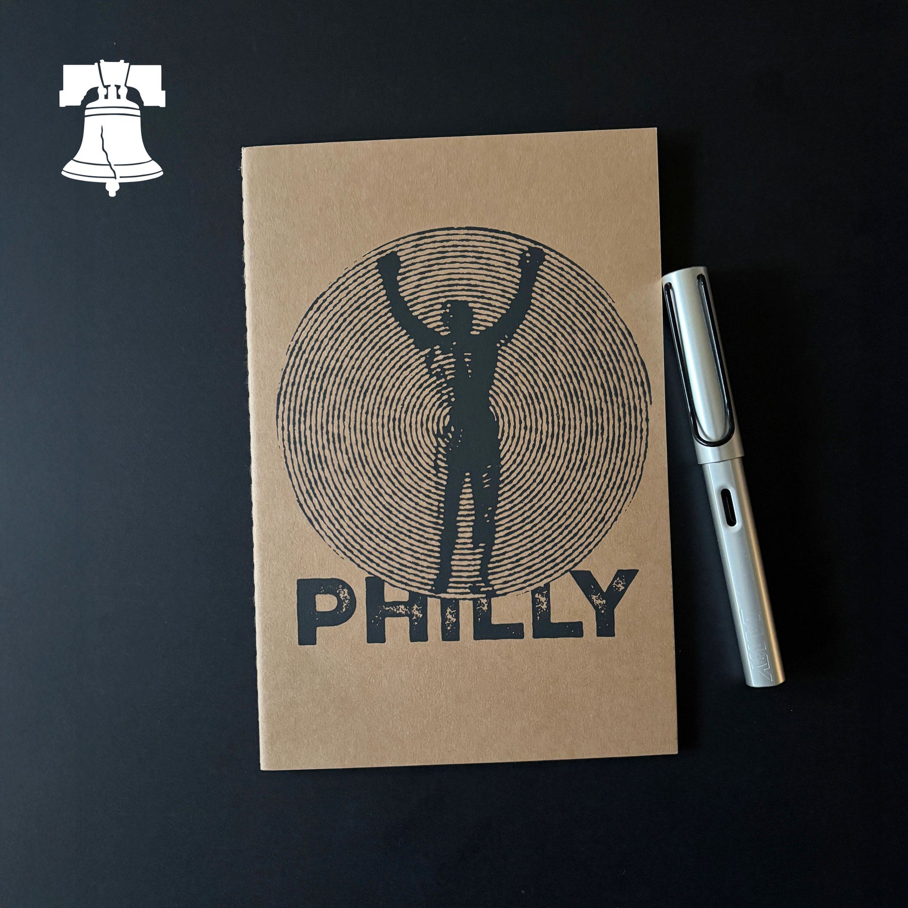 Pure Philly on paper. The Rocky Steps design celebrates one of the city’s most famous views — a simple, bold line drawing printed by hand on a natural kraft cover.